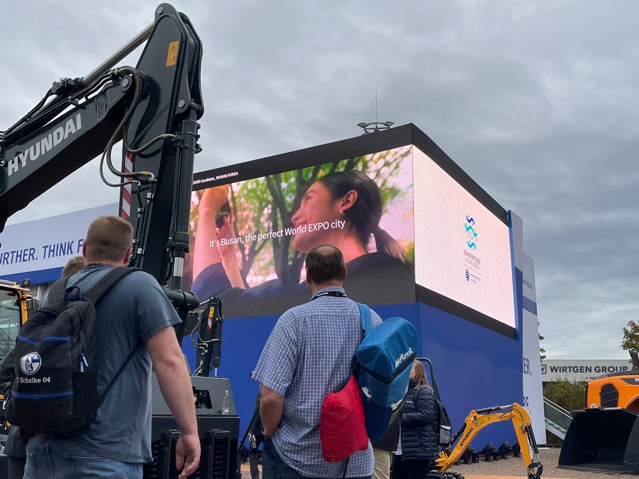 ■Photo Description: Visitors watching a World Expo 2030 Busan promo video at the ‘BAUMA 2022’ Hyundai Construction Equipment booth, held in Munich, Germany