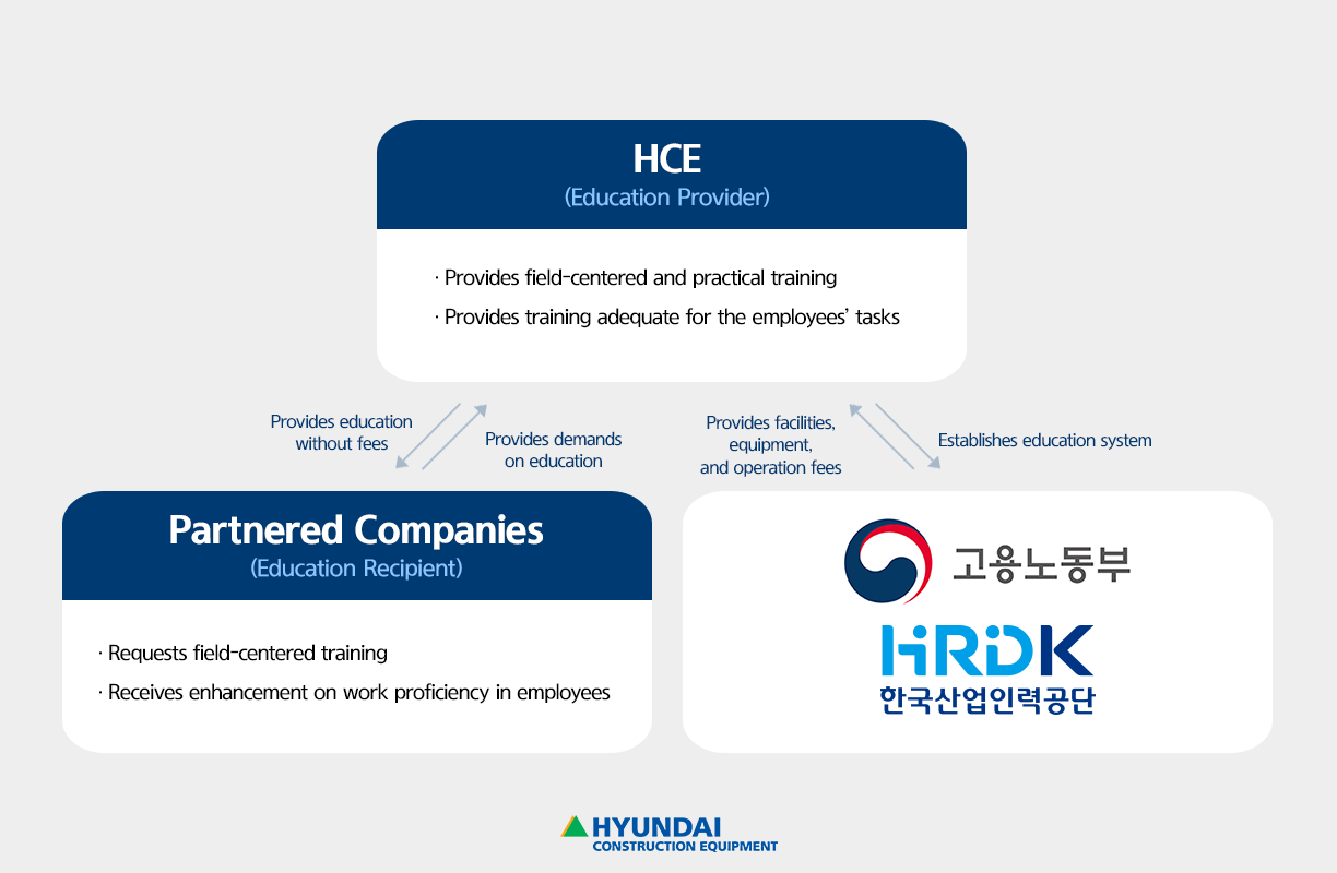 National Consortium for Human Resource Development is a representative project for developing occupational capability led by the Ministry of Employment and Labor. The project involves verified corporations or institutions providing education or training to smaller companies that relatively lack the ability to educate their employees to enhance their work proficiency. The consortium selected HCE’s Global Education Center as a partner institution for the construction equipment industry in July 2020. Since then, the education center has conducted numerous programs centered on improving the occupational capability of employees from the partnered companies.