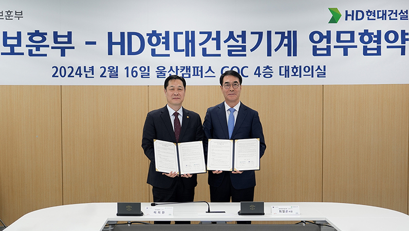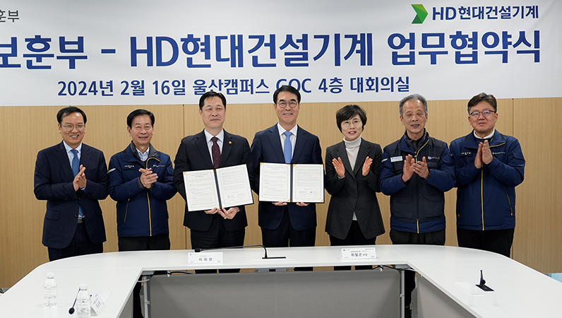 HD현대건설기계가 16일(금) 울산 신사옥 글로벌오퍼레이션센터(GOC, Global Operation Center)에서 최철곤 사장(사진1, 오른쪽), 국가보훈부 이희완 차관(사진1, 왼쪽)을 비롯한 관계자들이 참석한 가운데 ‘국가유공자 하우스 리모델링 사업’에 관한 업무협약(MOU)을 체결했다.