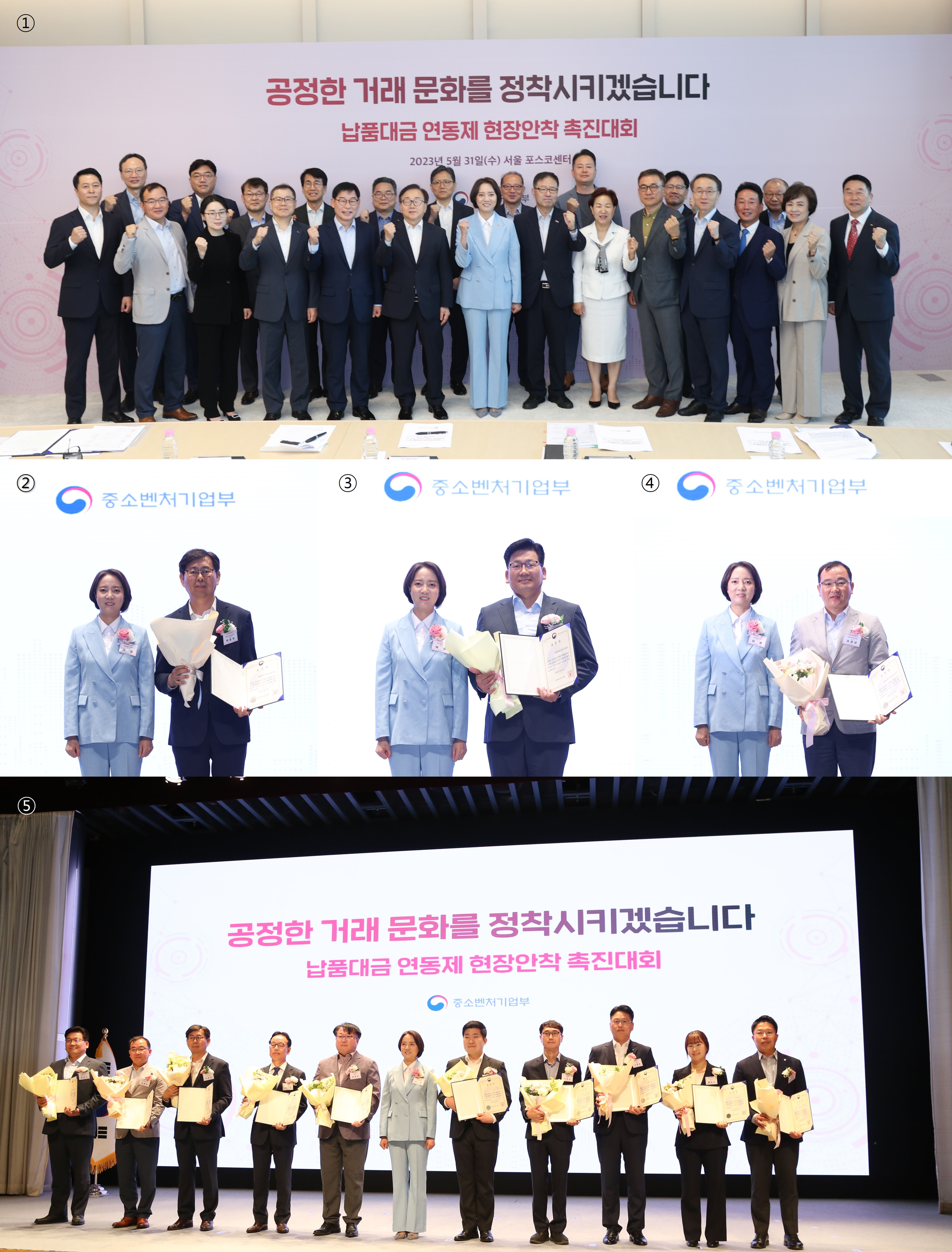 ① 중소벤처기업부에서 5월 31일 서울 강남구 포스코센터에서 개최한 납품대금 연동제 ‘현장안착 촉진대회’를 개최했다.