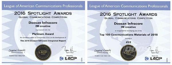 한편, 두산인프라코어는 지난 2011년 지속가능경영보고서로 영국 CRRA(Corporate Register Reporting Awards) ‘창의성’ 부문 우수 사례로 선정됐으며, 2014년 통합보고서는 LACP ‘2015 스포트라이트 어워즈’에서 금상을 수상한 바 있다. 〈끝〉