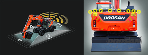 ▲ 운전자가 작업에 집중해 모니터를 확인하지 못했을 경우 후방경고시스템이 굴삭기 후방, 측방의 센서를 통해 위험을 감지, 경고음을 울린다.